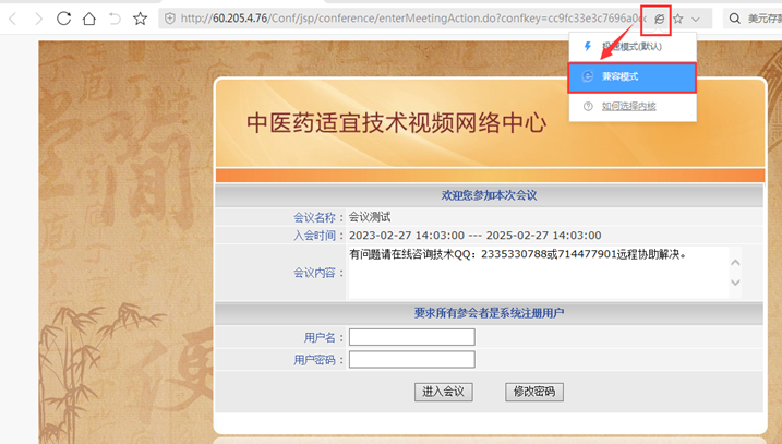 5.360浏览器设置兼容模式,输入用户名和密码,点击【进入会议】